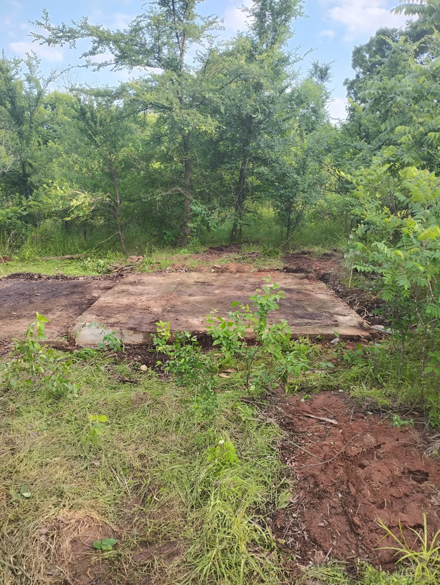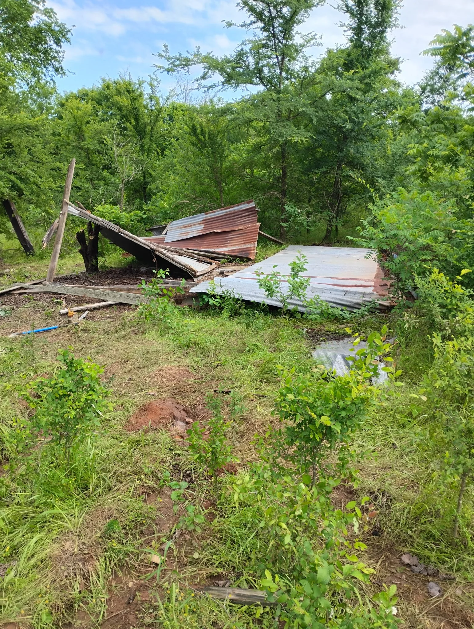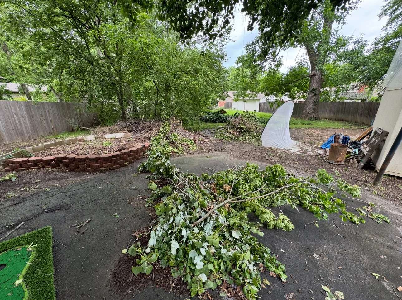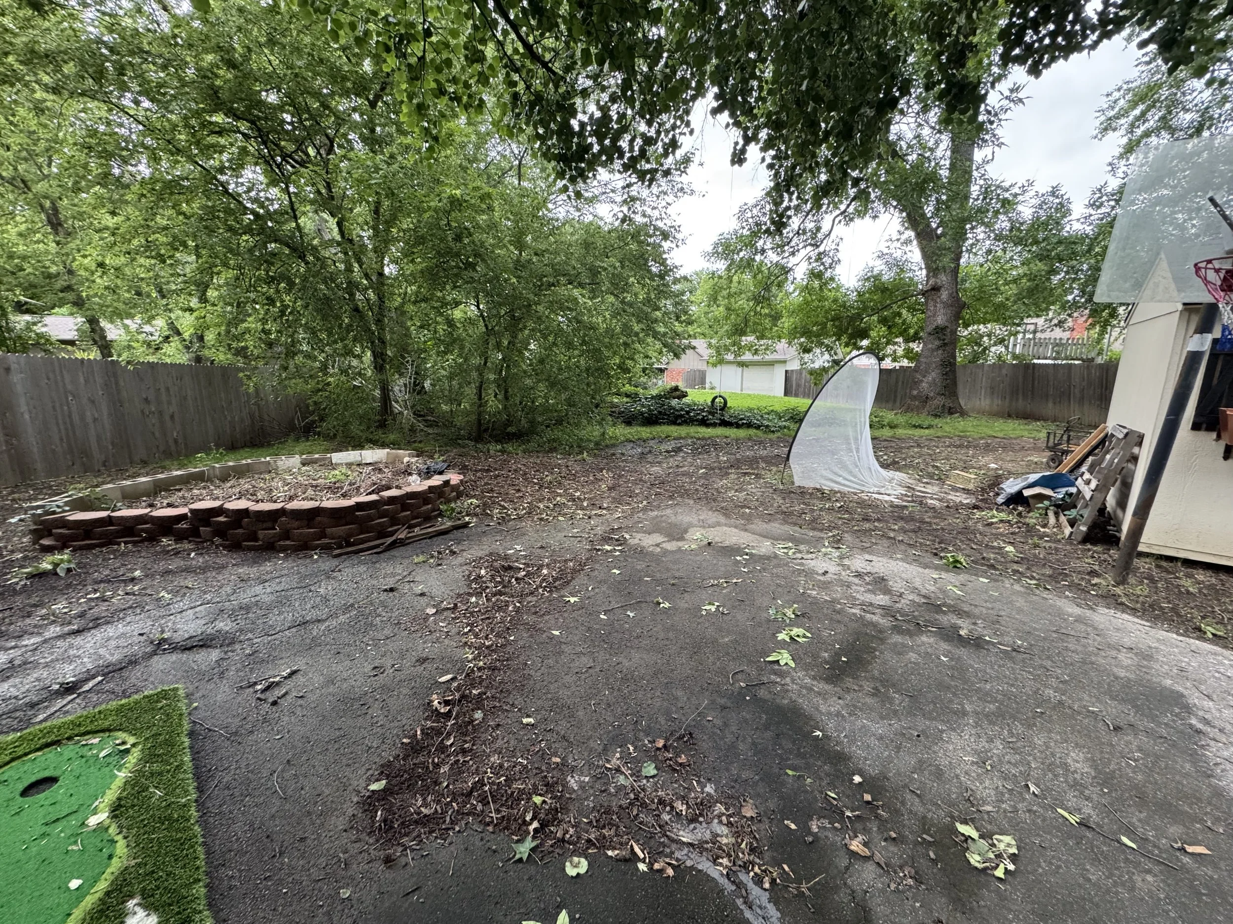 Backyard with fallen tree branches, garden debris, a small white screen, and a metal trash can. Wooden fence surrounds the yard, and there are trees and a shed in the background.