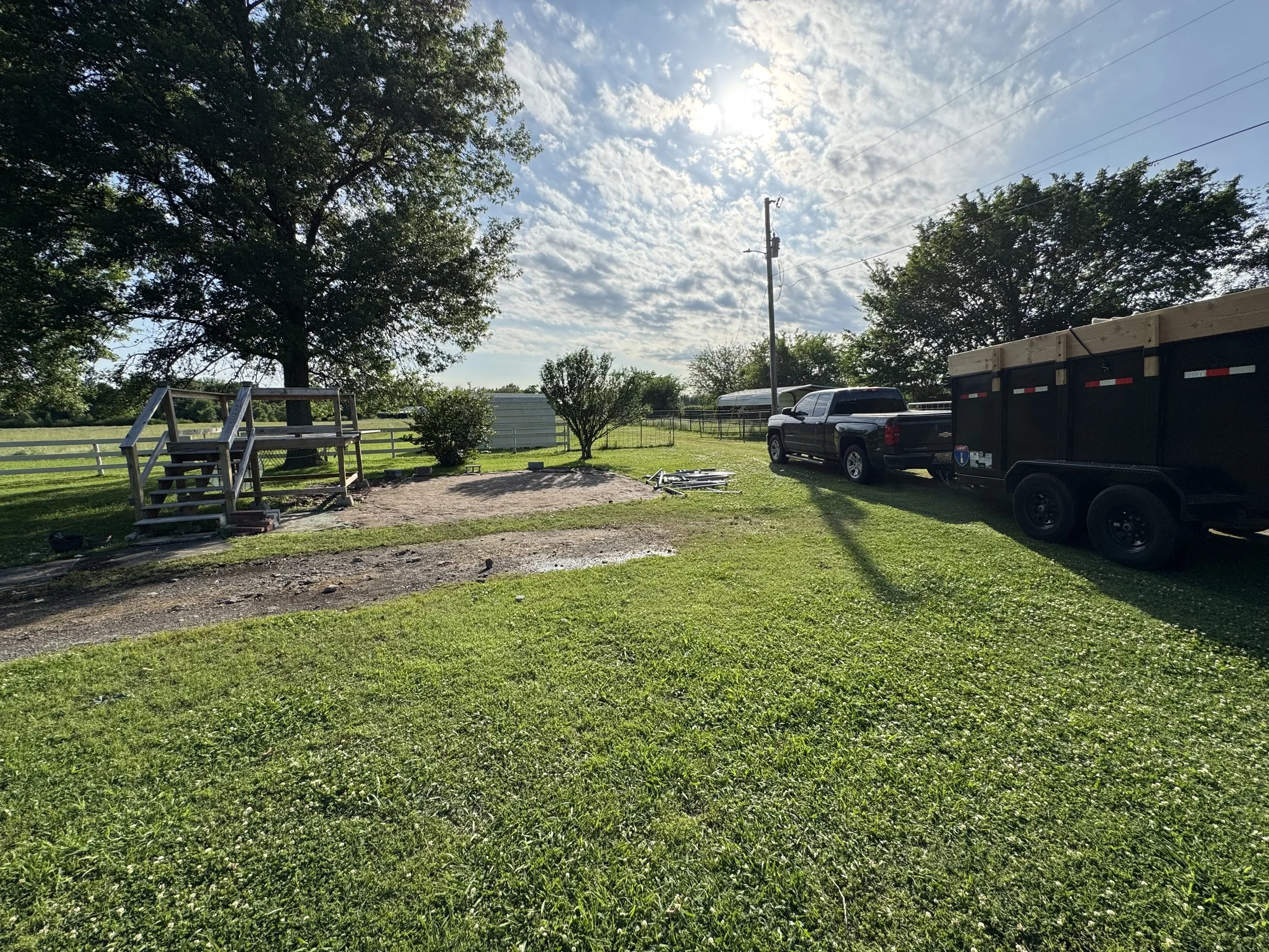 A sunny backyard with green grass, a large tree, a small wooden staircase, some bushes, a trailer, a pickup truck, and a metal frame lying on the ground; power lines and a blue sky with clouds are visible in the background.